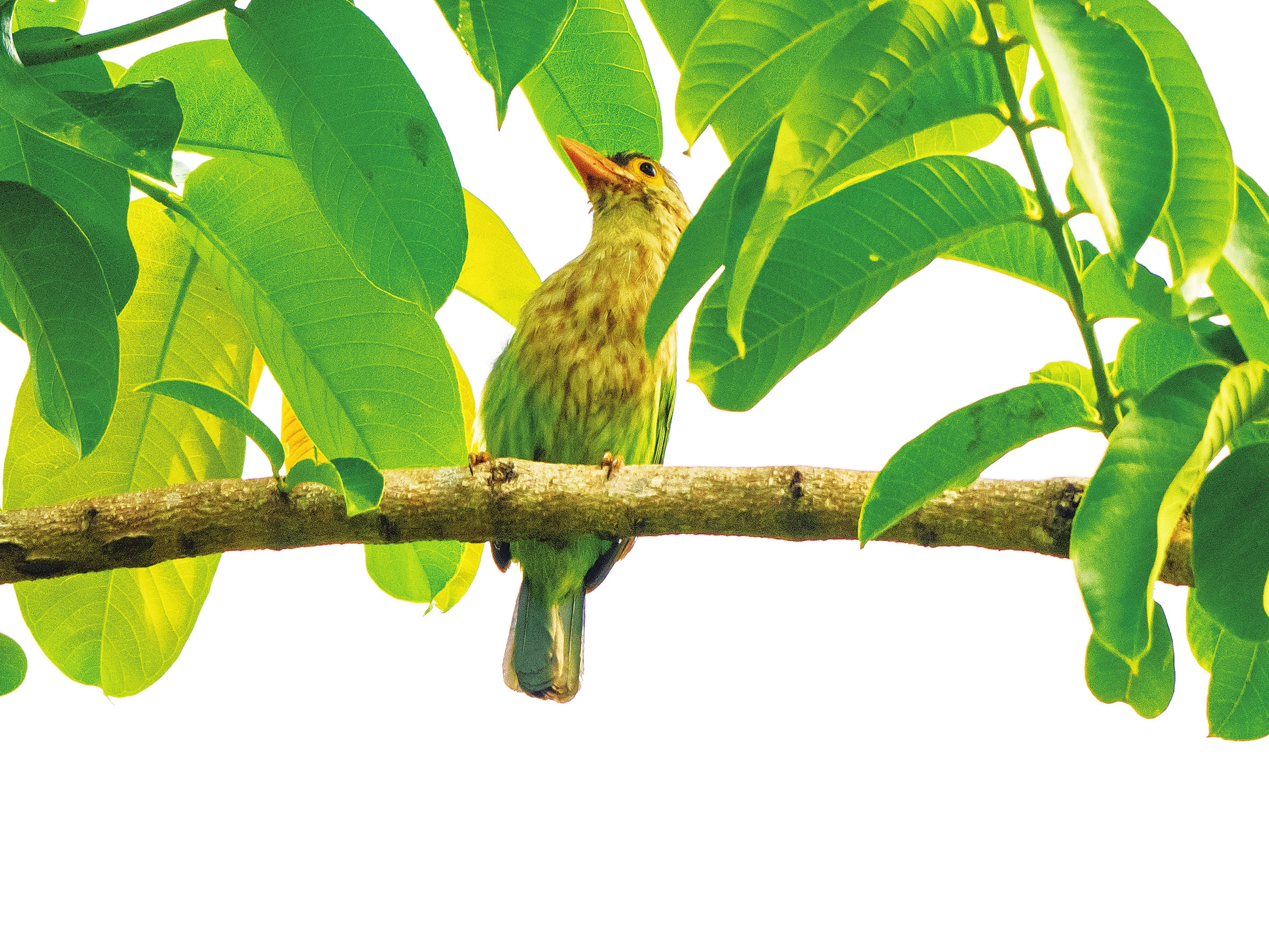 绿拟啄木鸟隶属于啄木鸟目拟啄木鸟科,是一种栖息于热带常绿阔叶林的中型鸟类。成鸟体长26至30厘米,体羽以翠绿色为主,头顶呈暗灰褐色并缀有淡色纵纹,眼周裸露皮肤呈鲜黄色,喙部在繁殖季节呈现橙粉色,外观极具辨识度。该鸟通常单独或成对活动,鸣声洪亮、节奏分明,主要以榕树果实等植物性食物为食,也捕食昆虫,对种子传播和森林生态平衡具有重要作用。