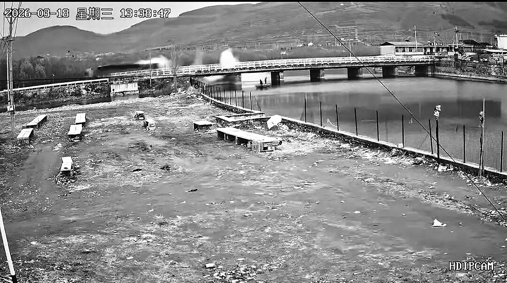 一段网传监控视频显示,3月18日13时38分,一辆大货车驶过山东费县大王庄桥,被货车压过的一段桥面突然破损,桥梁建筑材料落入水中,激起巨大水花。货车驶离桥面后停下。画面中,河里有人划船经过附近。