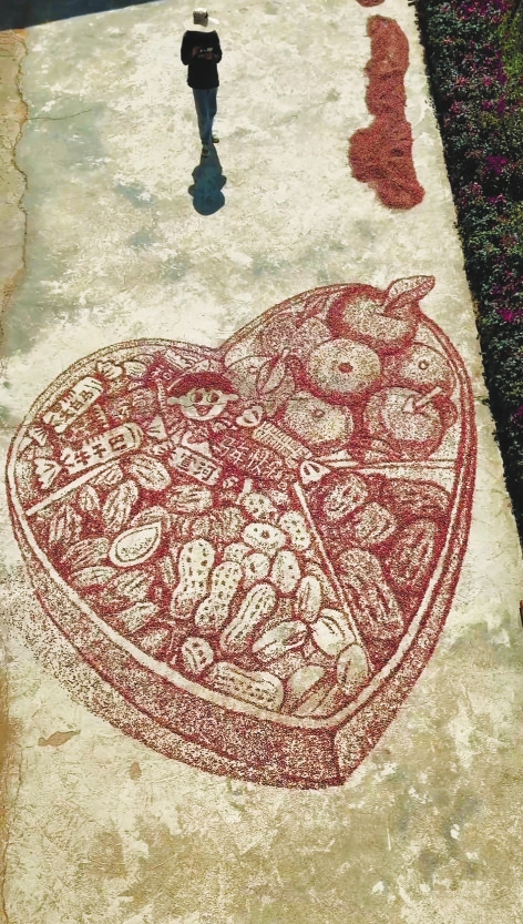 3个月时间里,他完成了20幅作品。画面多为乡土生活场景:孩童、小狗、农产品……题材质朴动人,既有烟火气,又饱含对乡村的深情。他特别介绍,这种红玉米是云南独有老品种,画作完成后,玉米粒可回收再画,环保又实用,真正做到“源于乡土、回归乡土”。