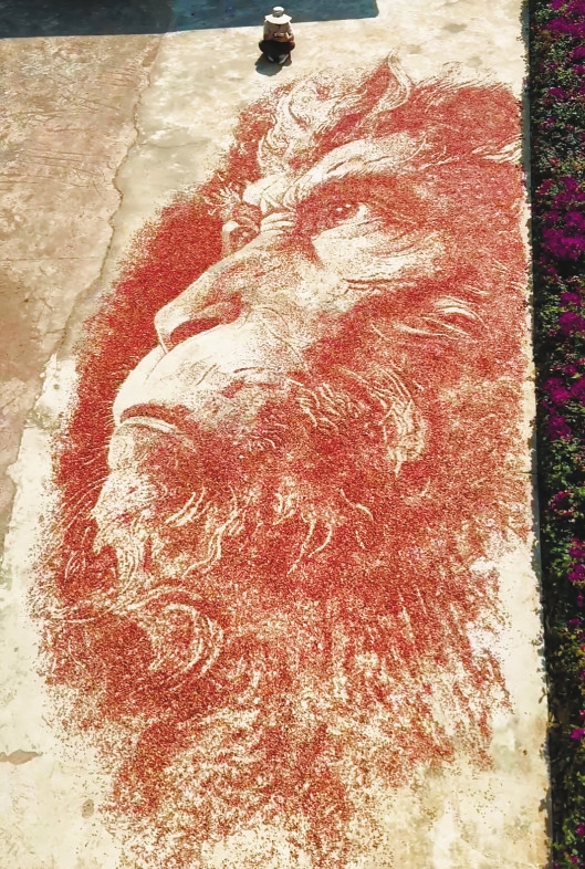 创作全程由宁思独立完成。没有助手,不搞排场,只利用个人休息时间,一粒一粒精心排布。每一幅画短则数米,长可达十几米,单幅创作往往耗费五六个小时。从构图、选粒、铺排到调整,每一步都倾注心血。“傍晚扒两口饭就抓紧时间画一画,第二天早点起来再画一下。”宁思说。