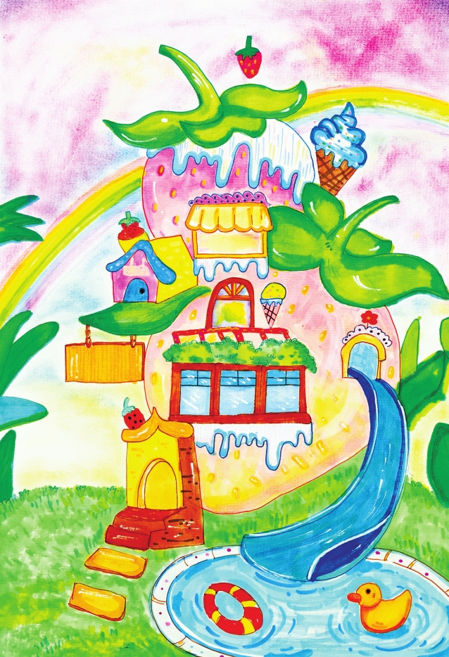 作品介绍:草莓冰淇淋做的梦幻小屋,小黄鸭在水里嬉戏,彩虹挂在粉紫的天空,整个画面充满了甜甜的童话感。