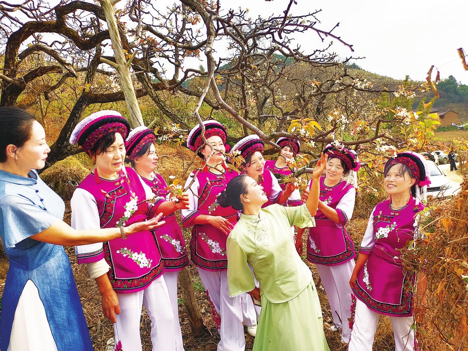 在文艺演出现场,现场众人牵手围圈、踏歌起舞,台上台下融为一体。大家一曲接一曲尽情欢跳,欢笑声、喝彩声与漫山梨花的淡淡清香交织,成为春日里动人的旋律。