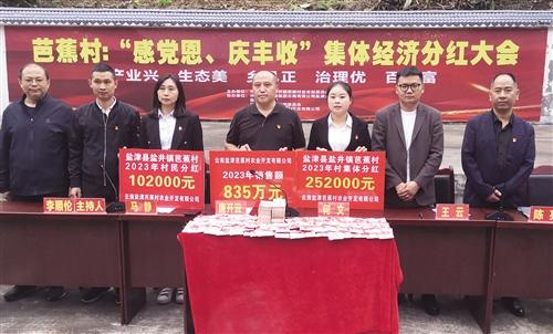 产业兴,乡村兴。2021年11月,云南移动驻村工作队引入销售职业经理人,创新消费帮扶模式,拓宽消费帮扶渠道,成立云南盐津芭蕉村农业开发有限公司,通过“党建+832平台+村集体经济+合作社+电商销售”的商业模式,整合云南移动彩云优品平台资源,2年间累计实现销售收入1000余万元,为村集体经济带来分红30余万元。今年,公司在上海、深圳、昆明相继设立了专门的盐津县消费帮扶选品馆,在“832平台”上线产品超过60余款,依托中国移动公司平台,上线中国移动积分商城,全力构建产供销一体化模式,持续推动消费帮扶,不断壮大村集体经济,为盐井镇产业振兴找到了更多的方向和更好的发力点。目前,公司经营收入达到835万元,较2022年增长了600余万元,可为芭蕉村集体经济分红25.2万元,较2022年增加了15万元。于是,芭蕉村党总支决定,今年向204名村民各分红500元,共计10.2万元,较2022年增加了7万余元,另外的15万元将用于村集体公司扩大再生产和公益事业。