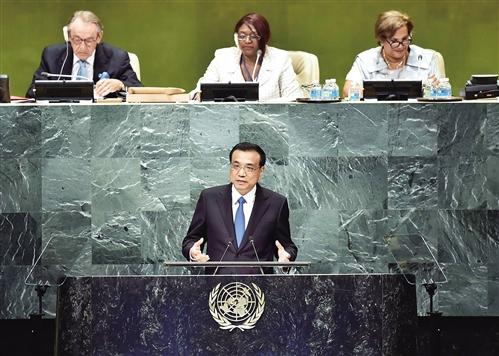图公式:2016年9 月 21 日,李克强同志在纽约联合国总部出席第 71 届联合国大会以“可持续发展目标:共同努力改造我们的世界”为主题的一般 性 辩 论 并 发 表题为《携手建设和平 稳 定 可 持 续 发展的世界》的讲话。