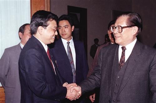图②:1993 年 5 月 3 日下午,中国共产主义青年团第十三次全国代表大会在北京人民大会堂开幕。在 5月 3日上午的预备会议后,举行第一次主席团会议,推选李克强等同志为主席团常务主席。这是江泽民同志与李克强同志握手。 新华社记者 郭占英摄