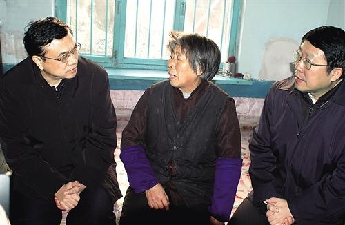 图⑤:2004 年 12月26 日,李克强同志到辽宁省抚顺市莫地沟棚户区居民王淑贞家中走访调研。