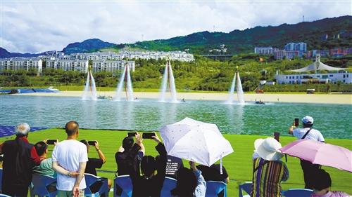 闵行区游客在绥江县金沙水上乐园欣赏水上特技滑水表演。