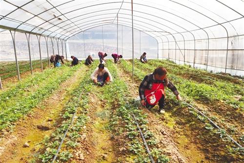 雨水时节,水富市各地的农民陆续展开春耕备耕等农事活动。图为农民在大棚里管理草莓。