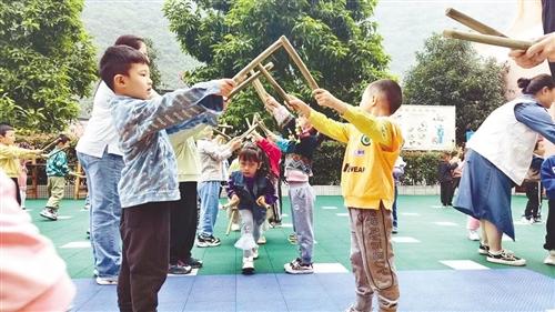 玩转“竹子” 乐趣无穷 近日,水富市两碗镇中心幼儿园开展以“竹”为特色的游戏活动,不仅丰富了课程,还促进了幼儿园的发展。孩子们在老师及家长的引导下,将竹竿作为体育器械跳舞、做早操,还叠高塔、搭灶台、拼迷宫、跳格子等。经过一次次的练习,孩子们找到了乐趣,锻炼了他们的手眼协调能力和想象力。 通讯员 邓世琴 摄