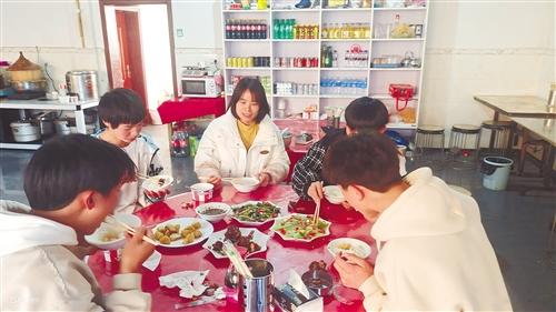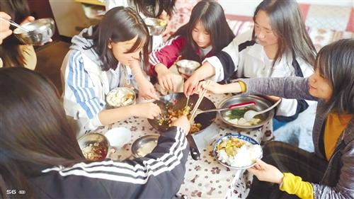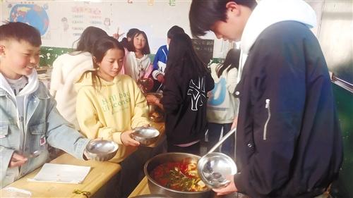 在苏甲乡中学79班教室里,50多名学生围在一位女教师身边,开心地笑着、闹着。女教师一边给学生满满地舀上一大勺菜,一边笑呵呵地跟学生说着话,关切之情溢于言表。