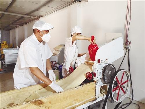 在永善县大兴镇老街社区金沙江畔的月亮湾,有一个2400多平方米的大院子,里面有一间近200平方米的标准化厂房,2台小型面条机,正源源不断地生产出土碱面,王文洪、吴荣和工人,正在精心制作“兴原面条”。