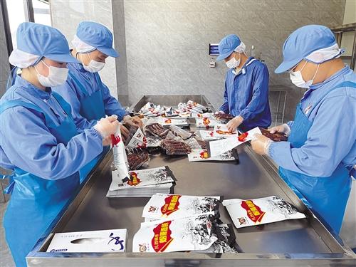 威信棒棒食品有限公司员工正在包装腊肉制品。