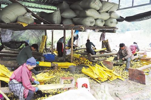 2014年7月,太平镇二溪村乡贤能人覃永兵发起成立太平中药材种植专业合作社,带领32户村民发展黄柏产业。“在水富市供销社的支持关心下,2016年,我们又成立了水富市太平中药材种植协会。目前,我们合作社种植了3360亩黄柏,我个人承包种植了235亩。”覃永兵一边指导工人采收,一边介绍,“今年进入黄柏采收季节,我聘请了60多名村民帮我采收加工,平均每天每人需支付工资200元,高的可以达到500元至600元,目前已经发出工资80多万元。”作为一名党员,覃永兵在带领村民们种植黄柏的同时,还积极为周边村民提供就业岗位,让他们在家门口就业,实现了顾家赚钱两不误。
