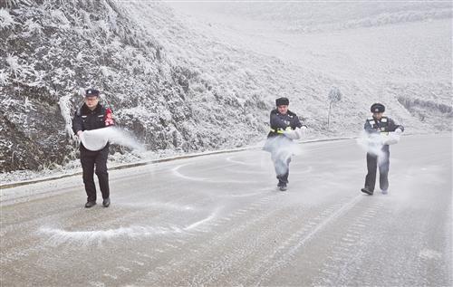 近日,受寒潮影响,永善县高海拔区域气温降至-5℃,导致部分道路结冰覆雪。永善警方迅速行动,投入百余警力开展抗冰保通工作。在马楠、水竹、莲峰等乡镇,民警抛撒融冰盐,指挥交通,救助被困车辆和人员。截至目前,警方抛撒融冰盐8吨,巡查60余公里,清除隐患21处。图为民警在路面抛撒工业盐融冰。