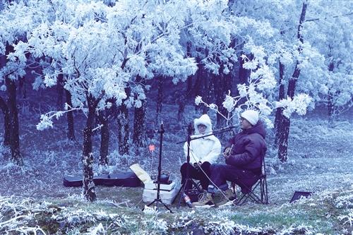 12月11日,由于天气降温,昭阳区大山包镇出现了雾凇景观,美不胜收,吸引了众多游客驾车前往观赏。一位名为“小马歌”的网友在前往大山包镇的途中,停车进入雾凇林中,边弹吉他边唱歌,并进行抖音直播,引来许多粉丝围观,点赞声不断。这一直播场景也成了雾凇风景中的一道亮丽风景线,引得许多游客停下脚步拍照留念。