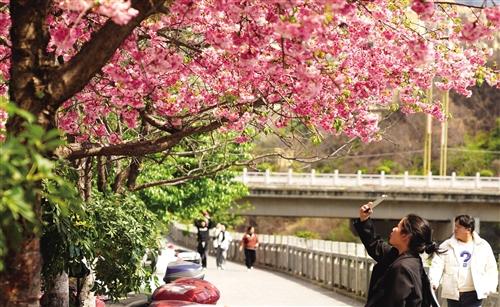 彝良赏花正当时 3月中旬以来,彝良县城廊桥旁的樱花争相绽放,廊桥在樱花的衬托下更显古色古香、古韵悠长,吸引市民驻足欣赏、拍照留念。图为市民在廊桥旁拍摄樱花。 通讯员 彭 洪 摄