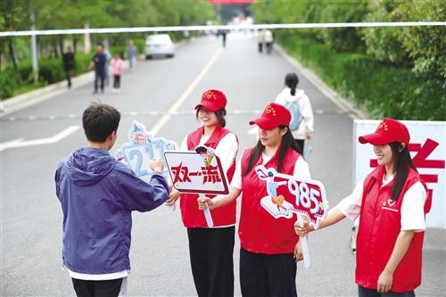 昭通市第一中学考点,志愿者举祝愿牌为考生助力。 记者 张广玉 摄