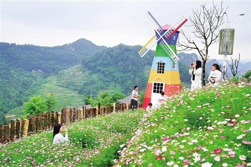 近日,踏入大屏上观景点,一大片绚烂夺目的格桑花海肆意绽放,游客们争相拍照,欢声笑语不断。花田旁,当地村民陶伟的小吃摊前人头攒动。
