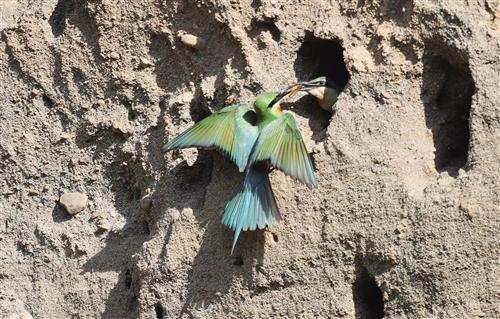 栗喉蜂虎哺育幼鸟。