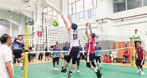 男子气排球比赛,队员拦网。
