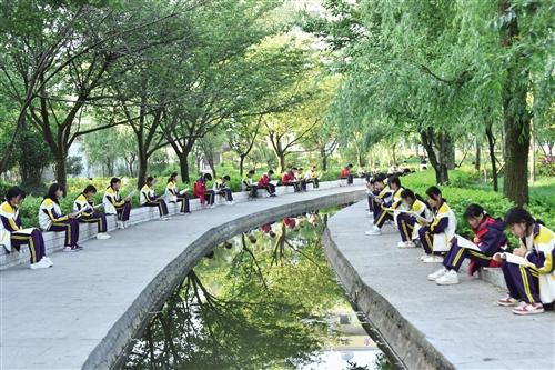 学生在优美的校园里晨读。记者 田朝艳 摄