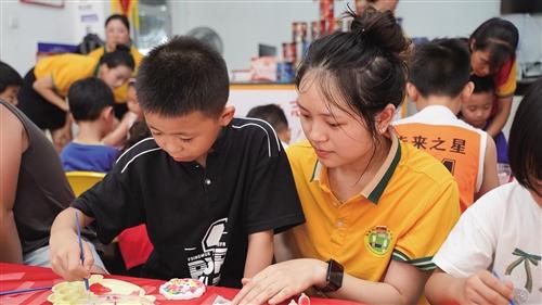走进发界安置区“一老一小”爱心家园暑期托管点,充足的自然光洒满房间的每个角落,阳光映照着光洁的地板和崭新的座椅,孩子们正握着画笔,专注地给画纸上的大树涂上自己喜欢的颜色,今天他们绘画课的主题是“我为大树穿衣服”,志愿者张栌尹正在指导孩子们色彩搭配,志愿者们不仅为孩子们带来知识,还带来了外面世界的鲜活气息,他们成了孩子们眼中可亲又可敬的“哥哥姐姐”。来自发界安置区的李云悄悄告诉笔者,“我以后也要好好学习,当大学生,像志愿者姐姐一样,帮助别人!”这颗梦想的种子,正在榜样力量的滋养下生根发芽。