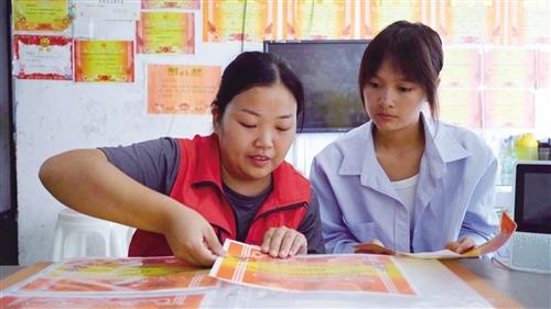 赵春碧(右)和县民政社工一起整理奖状。