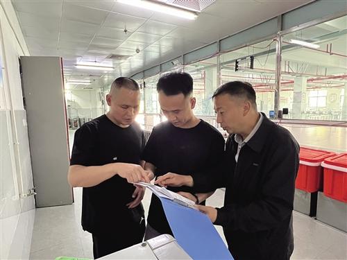 成海(右一)和同事在检查食堂档案。