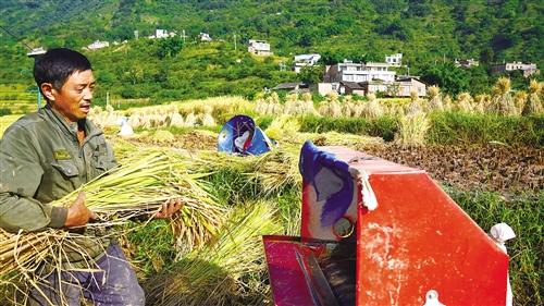金秋时节,彝良县1.7万余亩水稻陆续进入成熟期,农户们抢抓晴好天气收割水稻,田间地头呈现出一派忙碌的丰收景象,成为蓝天白云下最美的风景。图为角奎街道马窑村营盘组村民正在收割水稻。