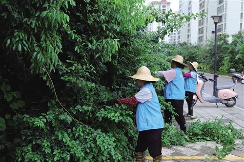 居民正在修剪杂乱的绿化带。