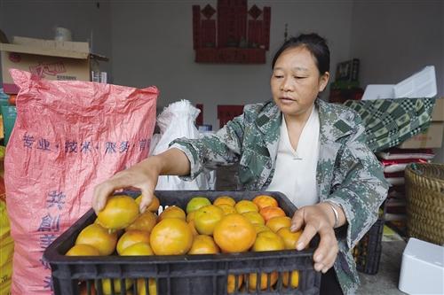 在郭家村岩脚村民小组,村民胡聪琴正坐在小板凳上,将刚从果园采摘回来的脆甜柿按照大小、品相进行分拣,好的果子单独归置,准备批量销往外地。“今年,我家种了 6 亩脆甜柿,预计产量 2500公斤。” 胡聪琴笑着说道。