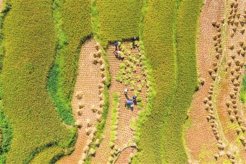 近日,在绥江县中城镇回望村夫人坝,数百亩高山梯田水稻渐次成熟。层层梯田尽染金黄,当地村民正抢抓晴好天气,忙着收割水稻。 通讯员 曾三东 摄