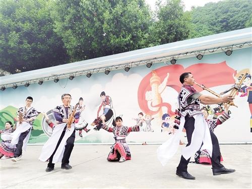 永善县马楠苗族彝族乡文化干部朱显光(左二)带领队员们表演芦笙舞。