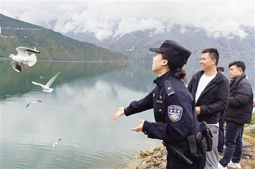 11月3日,溪洛渡水电站库区的金沙江上,一群海鸥掠水而飞。它们时而盘旋江面,时而俯冲啄食,洁白身影与巡逻的公安民警同框,定格成一幅灵动鲜活的冬日生态画卷。