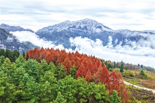 初冬时节,大关县翠屏山宛如一幅绚丽画卷。水杉如火,远山戴雪,晨雾如纱轻绕,松柏苍翠,与红杉交织出梦幻色彩。