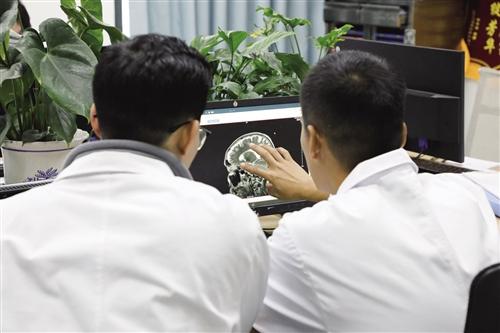 医生团队正在查看患者脑部CT。