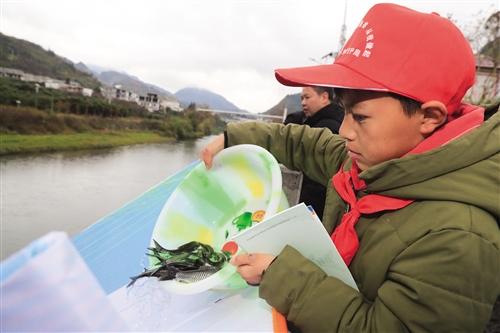 小朋友参与鱼苗投放活动。 记者 张广玉 摄