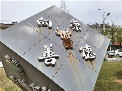 4月5日,南区市民健身公园一处“有礼衢州”宣传雕塑褪色严重,油漆掉落
