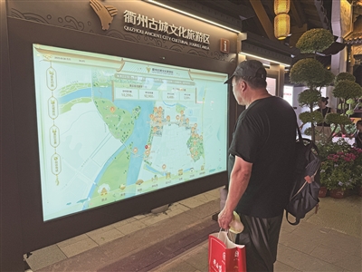在衢州古城水亭门历史文化街区,记者注意到水亭门牌坊口左手边显眼位置竖立着一块崭新的智慧导览屏。屏幕首页清晰地展示了街区的全景地图,各个景点都用醒目的图标标注。