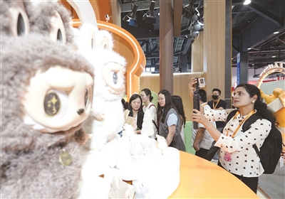9月10日,以“数智领航,服贸焕新”为年度主题的2025年中国国际服务贸易交易会在北京开幕。图为10日,一名记者在服贸会主题展POP MART展台拍摄。
