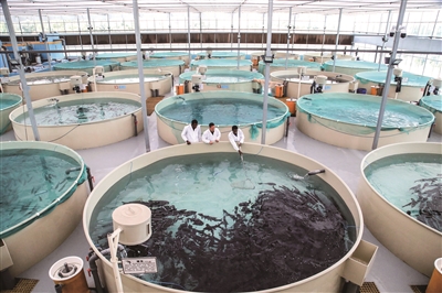 此刻,基地内百余个直径6米、深1.9米的循环水圆桶整齐排列,数万尾基地自主繁育的溪流鱼在恒温的清流中欢快游弋,层层涟漪反射着熠熠光芒。