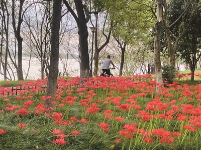 当然,秋天的凉意不是突然降临的,是悄悄渗透在时光里。白天,落在身上的阳光仍带着余温,可早晚时分,风里却带了几分凉意,这些是秋日悄悄的“提醒”,恰如城市中那些不张扬却需留心的细节,如金黄的黄山栾树花已悄然绽放,火红的石蒜花也竞相绽放,成为街头一道亮丽的风景线。