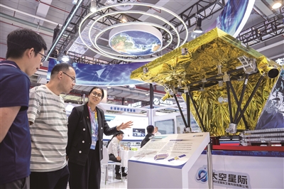 9月24日,第四届北斗规模应用国际峰会在湖南株洲开幕,本届峰会以“同世界·共北斗——智联时空”为主题,除开幕式外,还设置1场高端主旨演讲、5场主题论坛、6场学术交流、1个场景示范展等活动,展示北斗规模应用与经济社会的深度融合。图为24日,在株洲国际会展中心,工作人员(左三)在介绍一台对地观测卫星。 新华社发