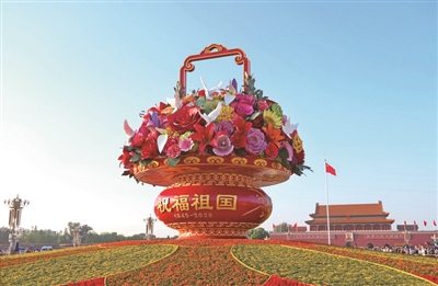 9月24日,“祝福祖国”巨型花篮正式亮相北京天安门广场,吸引了众多游客前来观赏、拍照。