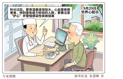 9月29日是世界心脏日,今年的主题为“律动不息”。对于中老年人来说,一颗健康有力、规律跳动的心脏,一套平稳运行的血管系统,是保障晚年生活质量的重要基础。专家提醒,秋分过后,昼夜温差逐渐加大,心血管疾病患者,特别是免疫力较低的人群,更需注意“护心”并警惕感染性疾病侵袭。新华社