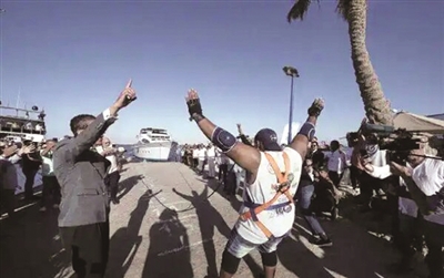 埃及大力士阿什拉夫·马哈鲁斯9月27日在胡尔加达创下一个惊人纪录:用牙齿咬住绳子拖动了一艘停泊水面、重达700吨的船只。