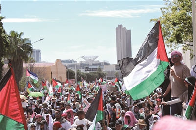 9月27日, 南非立法首都开普敦数千名民众举行大规模游行声援巴勒斯坦,抗议以色列在加沙地带的军事行动。图为当日,人们在南非开普敦参加声援巴勒斯坦的示威游行。 新华社发