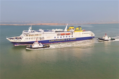 12月28日,255名韩国游客乘和谐云港轮抵达江苏连云港,开启5天中国跨年之旅。这是对韩免签政策实施以来,连云港海港客运口岸接待的最大规模韩国旅行团。图为28日,和谐云港轮抵达江苏连云港海港口岸。 新华社发