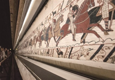 “巴约挂毯”长约70米,高约50厘米,以中世纪连环画的形式,生动记录了1066年法国诺曼公爵威廉一世征服英国、加冕英格兰国王的历史,具有极高的艺术价值和史料价值。这张挂毯以刺绣的方式呈现了史料中的重要场面、人物和武器器具,历经数百年仍清晰可辨。“巴约挂毯”现藏于法国巴约挂毯博物馆中,是当地最有名的古代文物。据法国新闻台报道,历史上“巴约挂毯”仅有2次外借,第一次是1803年应拿破仑要求在巴黎展出,第二次是1945年在卢浮宫展出。据环球网