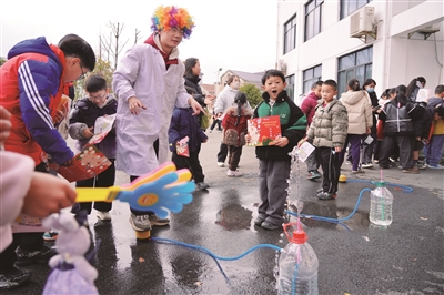 “大树穿新衣”课程的摊位前,彩色毛线编织的树衣格外亮眼——孩子们通过研究筛选出需要保温的树木,亲手为它们“穿衣”。司令台前,篮球技能展示动感十足,婺剧表演韵味悠长,尽显学生们的蓬勃朝气。